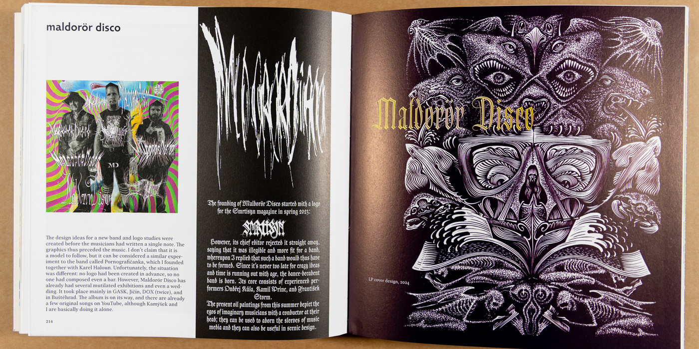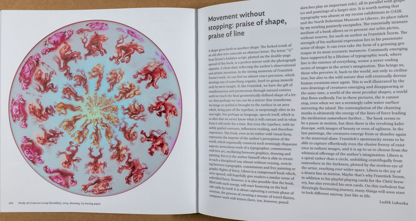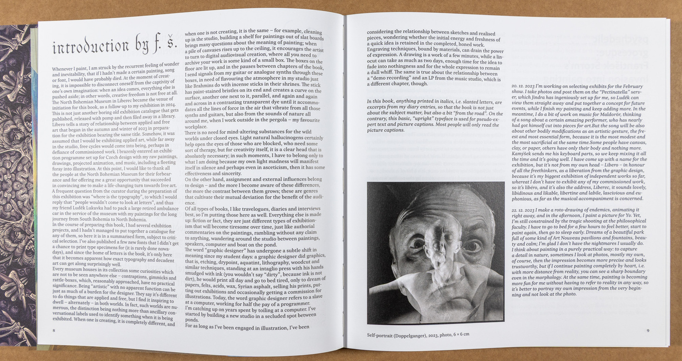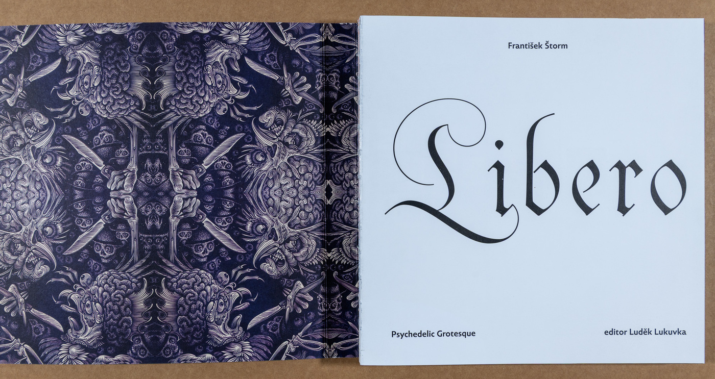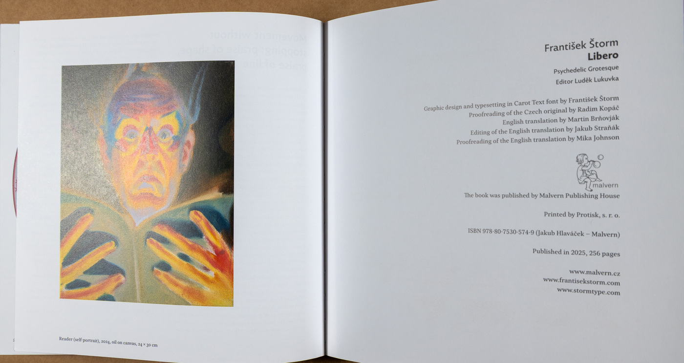 František Štorm (* 1966) is a world-known type designer, but also a composer and a founding member of the band Master’s Hammer. In parallel with his long-term work in the field of applied graphics and music, free work has always been created, especially linocuts and drawings, but in recent years also paintings of larger formats. The impetus for creating this book came from the success of exhibitions featuring paintings, graphics, and unique video projections. The book entitled Libero captures Štorm’s creative surge of recent years, in which typography, book illustrations, and graphic commissions naturally coexist with free work. Oil paintings inspired by, for example, South Bohemian ponds or travel experiences are increasingly gaining ground. Font shapes that we usually do not pay much attention to in books, together with painting, graphics and drawing, create a close connection in which both of Štorm’s lines of work illuminate each other in unexpected contexts. Libero also captures the breadth of his artistic scope in the visual processing of musical activities, thanks to which he appeals to a large circle of fans. The reader can enjoy wondrous, sometimes grotesquely psychedelic works in the neighbourhood of imaginative graphics and typography, the curves of which are the author’s defining gesture.