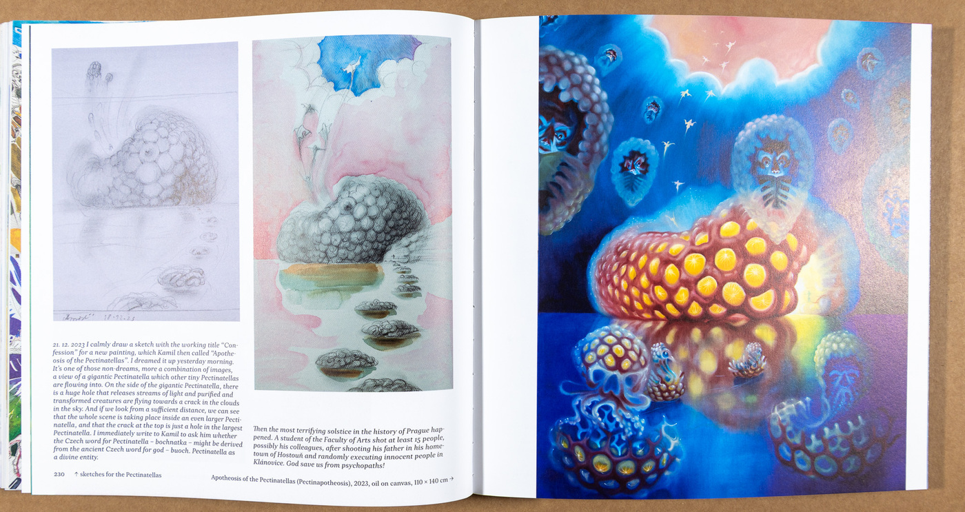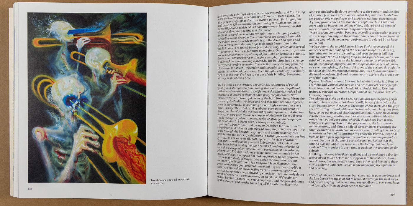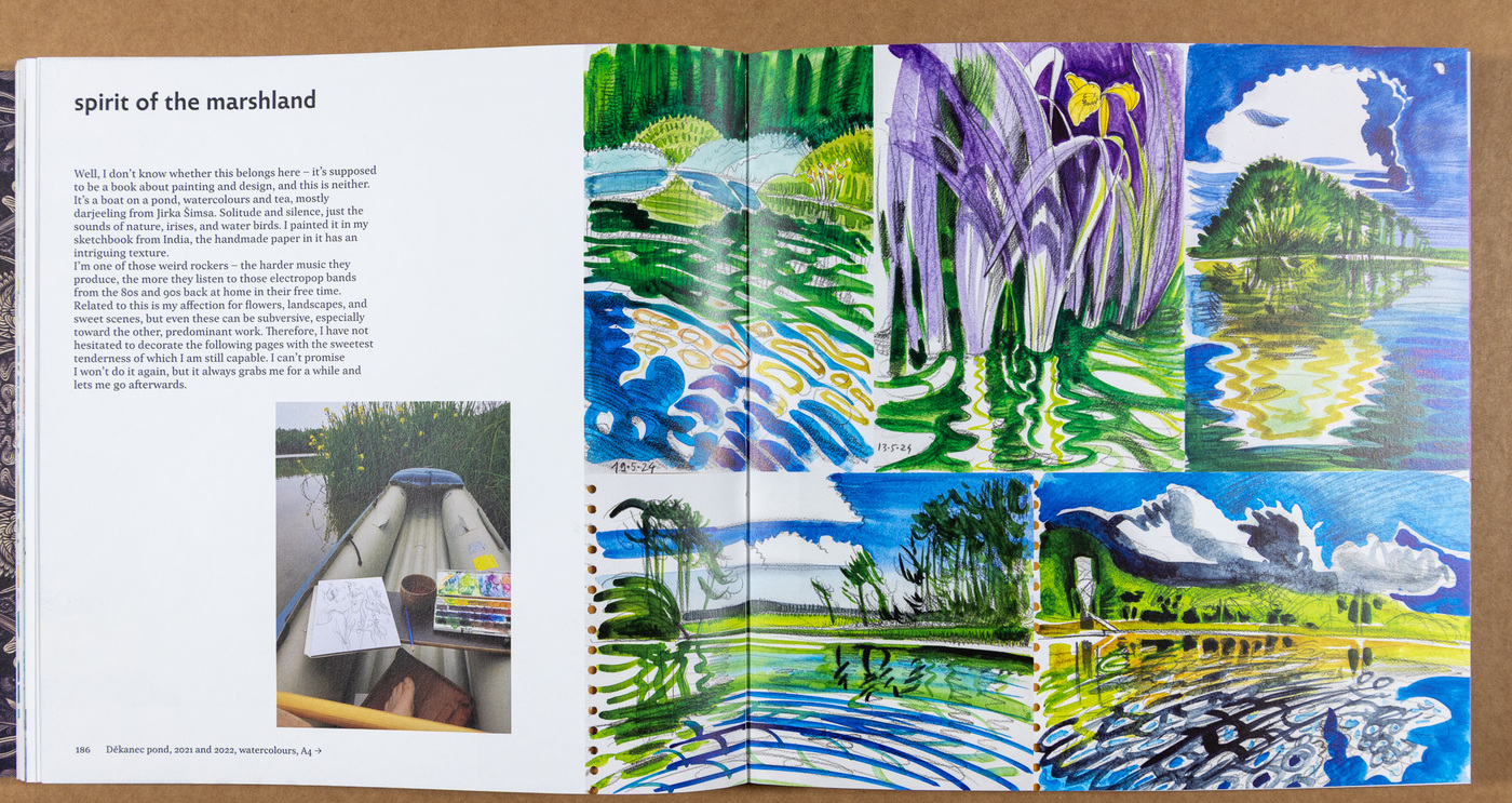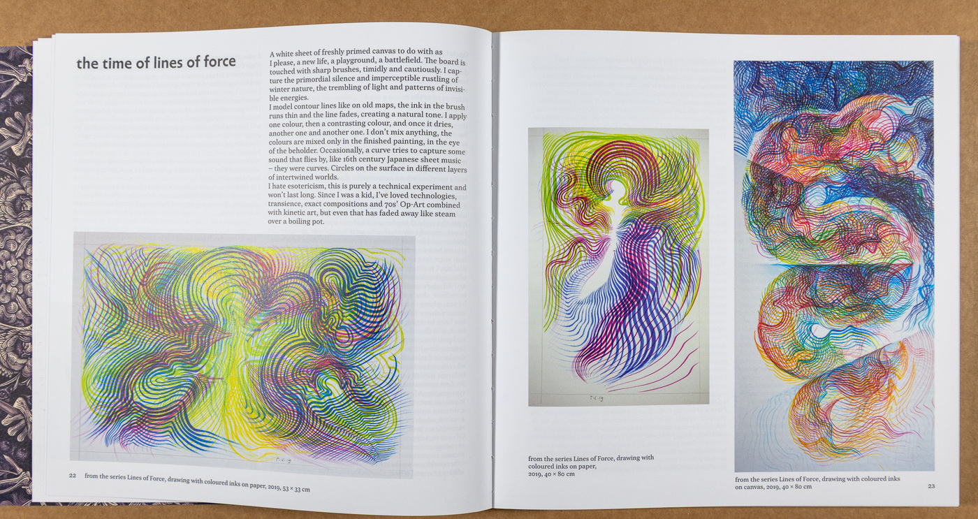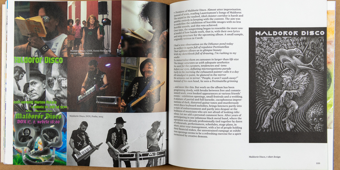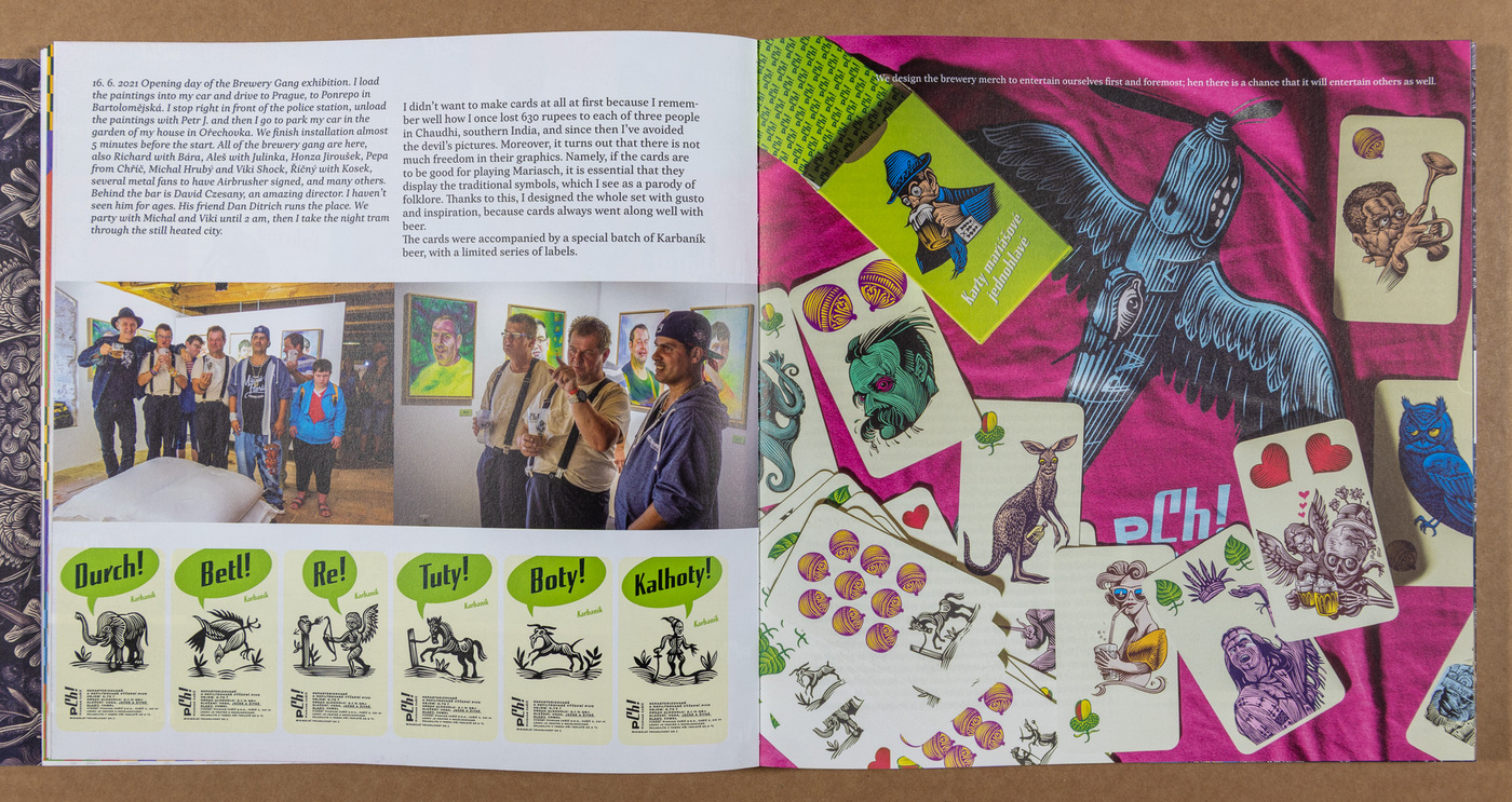 František Štorm (* 1966) is a world-known type designer, but also a composer and a founding member of the band Master’s Hammer. In parallel with his long-term work in the field of applied graphics and music, free work has always been created, especially linocuts and drawings, but in recent years also paintings of larger formats. The impetus for creating this book came from the success of exhibitions featuring paintings, graphics, and unique video projections. The book entitled Libero captures Štorm’s creative surge of recent years, in which typography, book illustrations, and graphic commissions naturally coexist with free work. Oil paintings inspired by, for example, South Bohemian ponds or travel experiences are increasingly gaining ground. Font shapes that we usually do not pay much attention to in books, together with painting, graphics and drawing, create a close connection in which both of Štorm’s lines of work illuminate each other in unexpected contexts. Libero also captures the breadth of his artistic scope in the visual processing of musical activities, thanks to which he appeals to a large circle of fans. The reader can enjoy wondrous, sometimes grotesquely psychedelic works in the neighbourhood of imaginative graphics and typography, the curves of which are the author’s defining gesture.