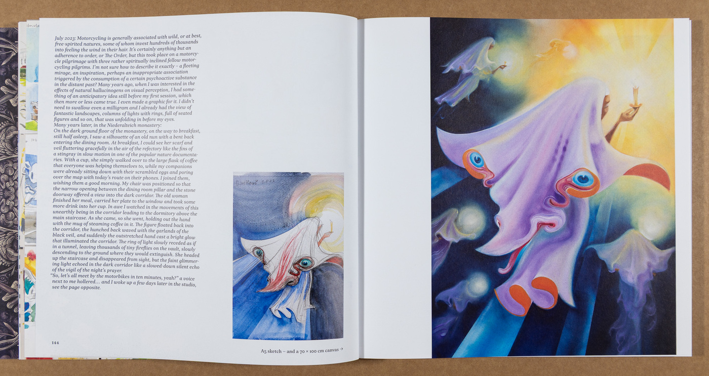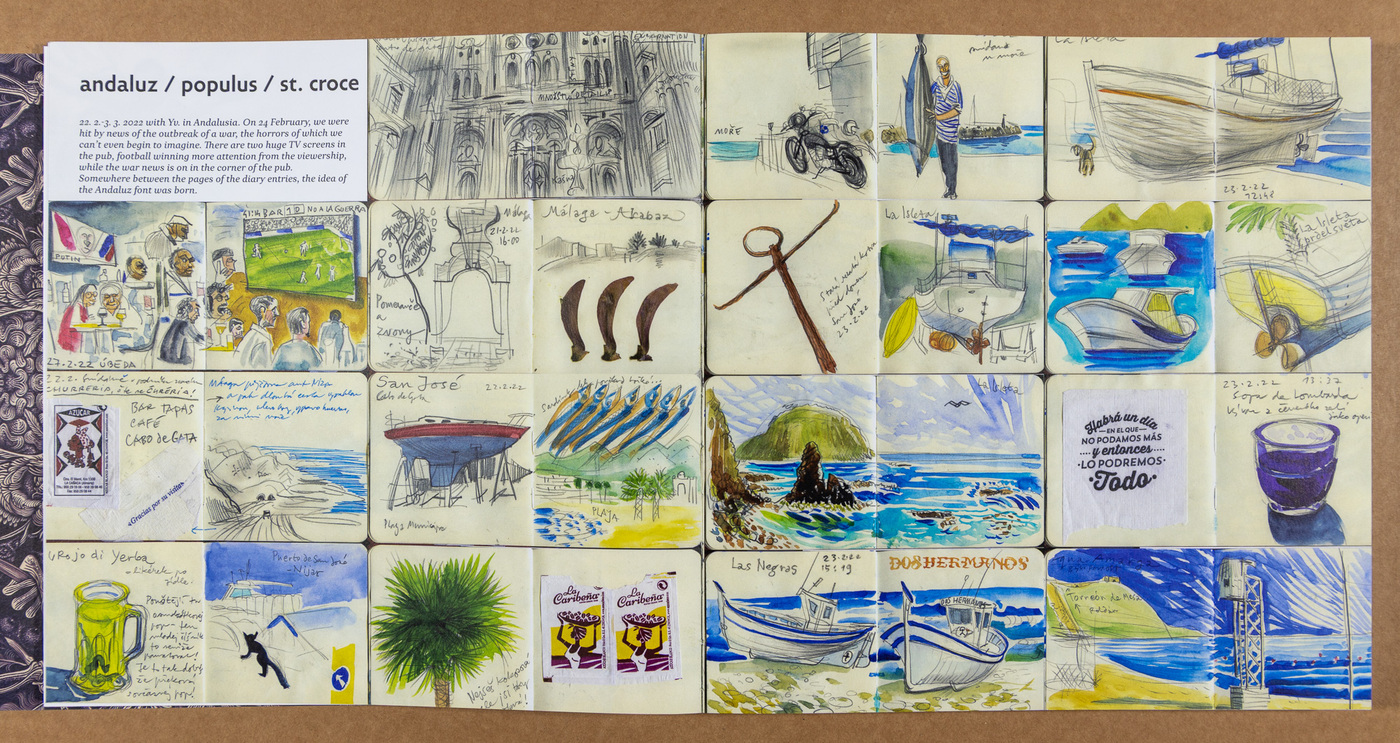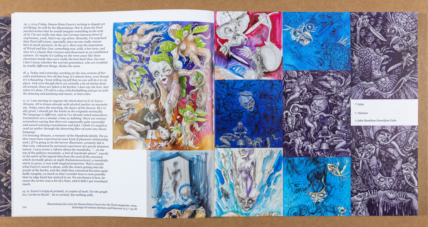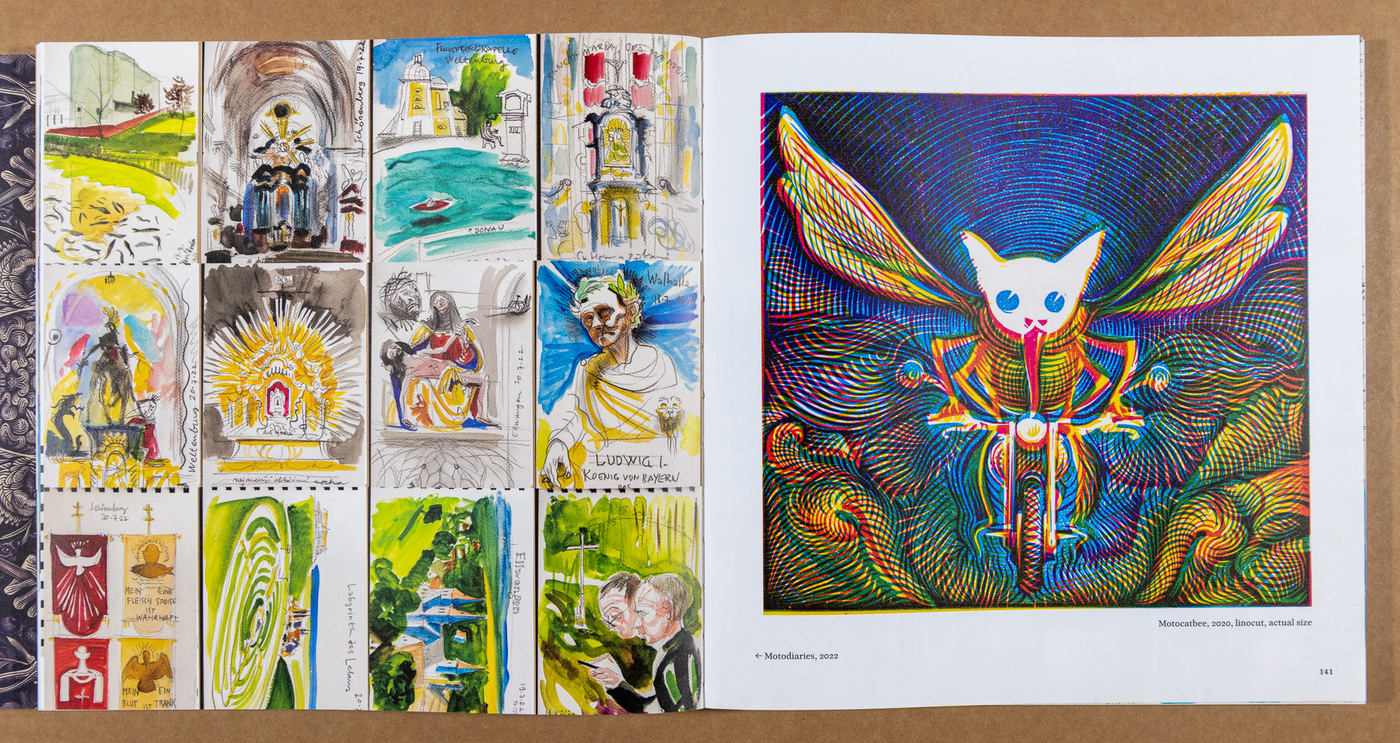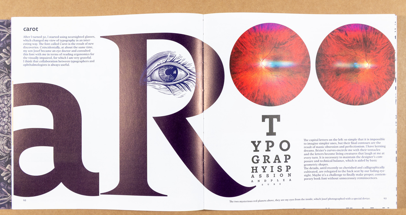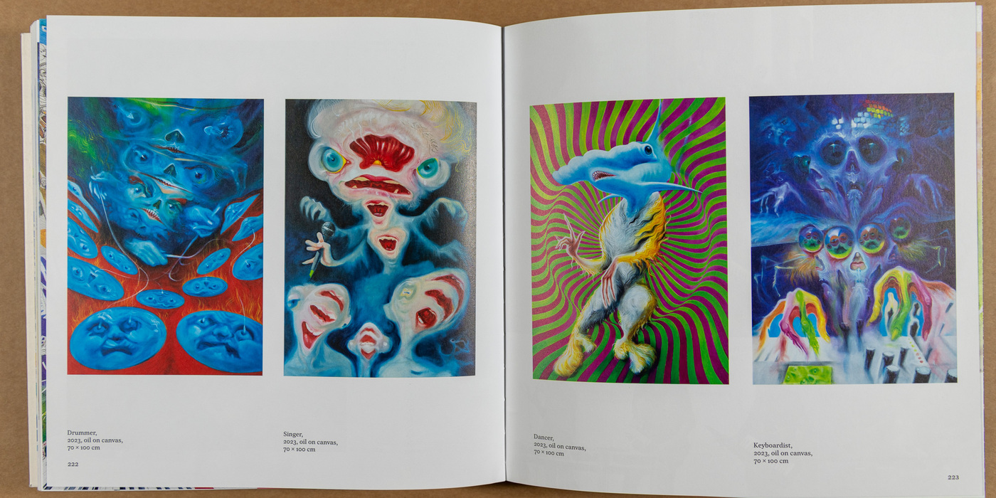 František Štorm (* 1966) is a world-known type designer, but also a composer and a founding member of the band Master’s Hammer. In parallel with his long-term work in the field of applied graphics and music, free work has always been created, especially linocuts and drawings, but in recent years also paintings of larger formats. The impetus for creating this book came from the success of exhibitions featuring paintings, graphics, and unique video projections. The book entitled Libero captures Štorm’s creative surge of recent years, in which typography, book illustrations, and graphic commissions naturally coexist with free work. Oil paintings inspired by, for example, South Bohemian ponds or travel experiences are increasingly gaining ground. Font shapes that we usually do not pay much attention to in books, together with painting, graphics and drawing, create a close connection in which both of Štorm’s lines of work illuminate each other in unexpected contexts. Libero also captures the breadth of his artistic scope in the visual processing of musical activities, thanks to which he appeals to a large circle of fans. The reader can enjoy wondrous, sometimes grotesquely psychedelic works in the neighbourhood of imaginative graphics and typography, the curves of which are the author’s defining gesture.