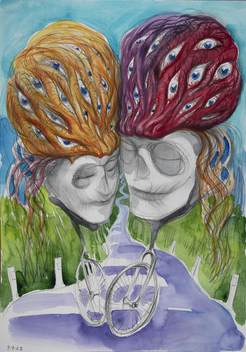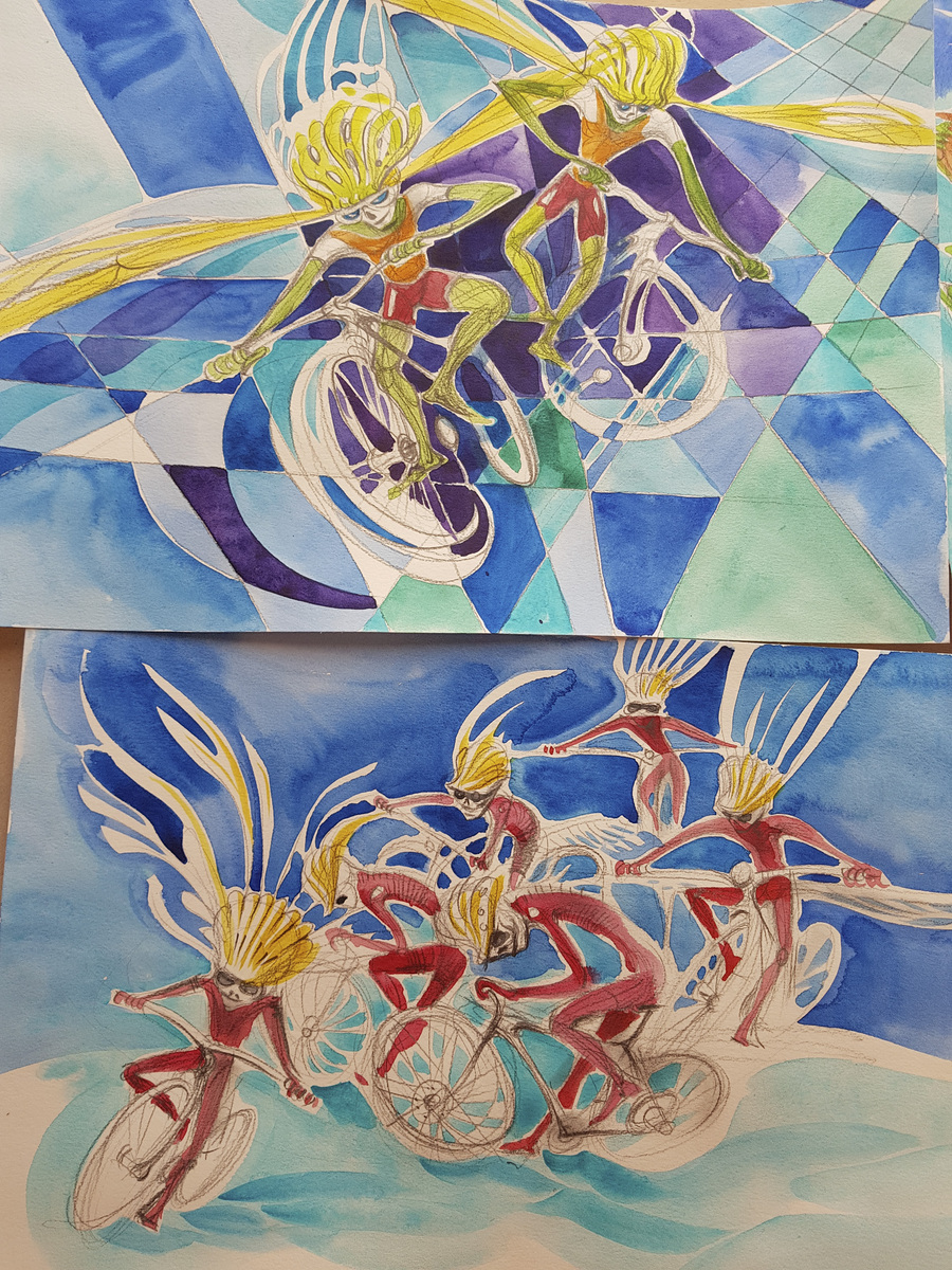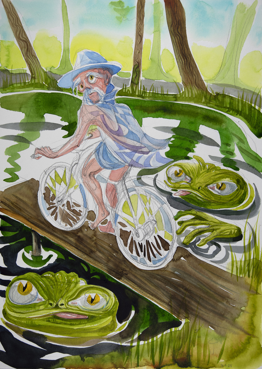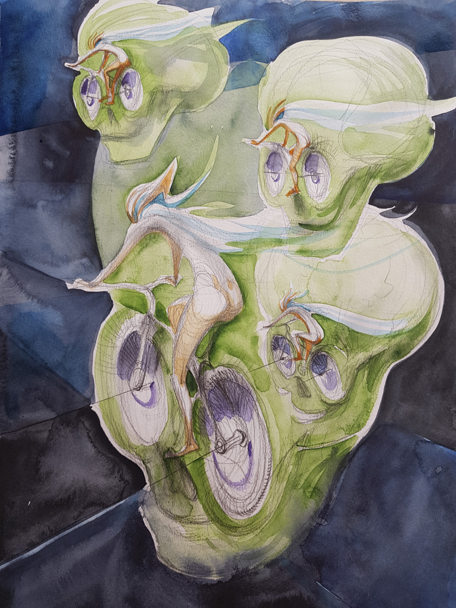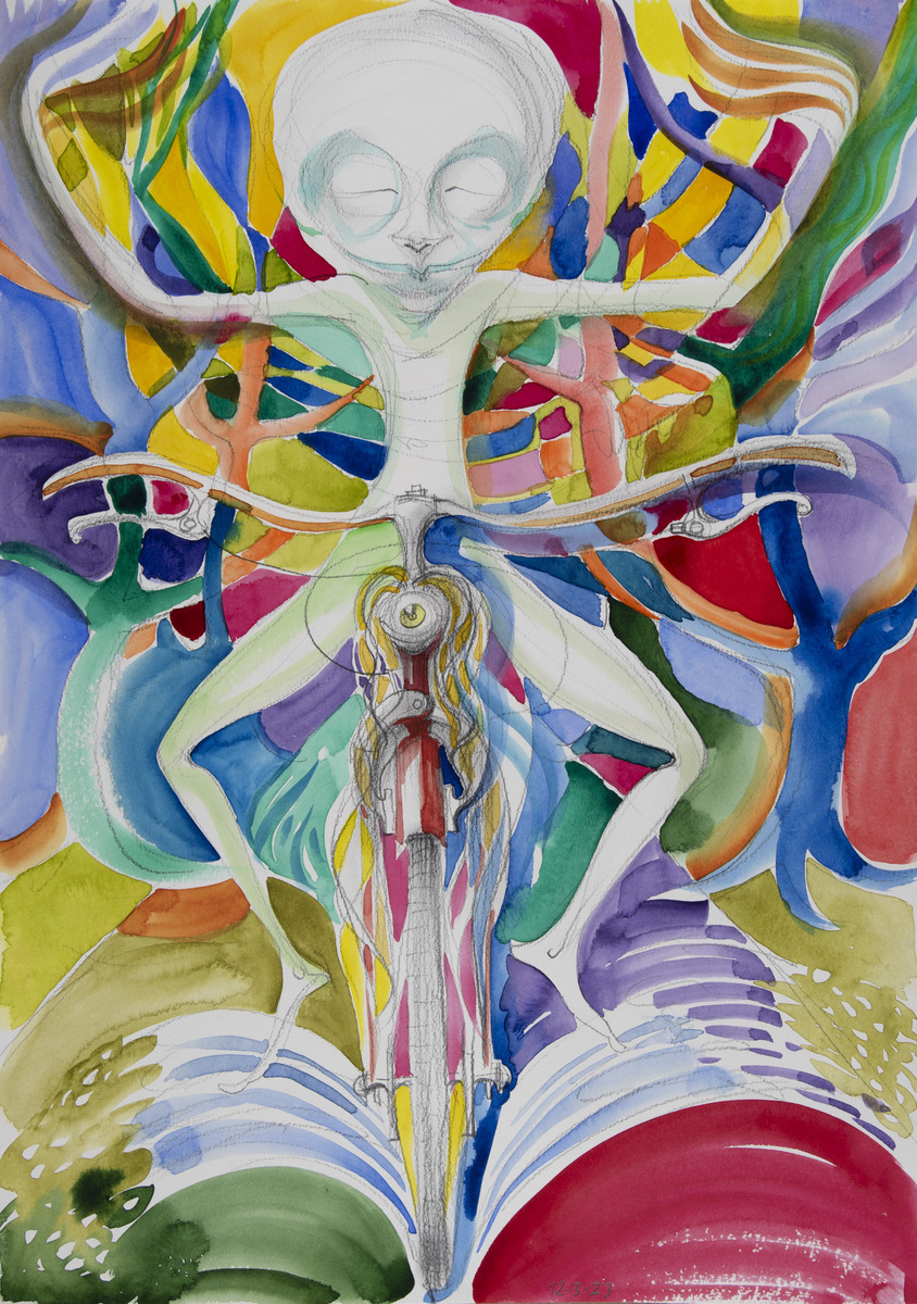 The cycle of watercolors on the theme of Bicycle Days was created on the occasion of the 80th anniversary of the famous Bicycle Day, which is associated with the invention of LSD. However, riding a bicycle in pure nature is an uplifting experience even without any hallucinogens. The gyroscopic miracle of balance and riding through avenues of blossoming trees...