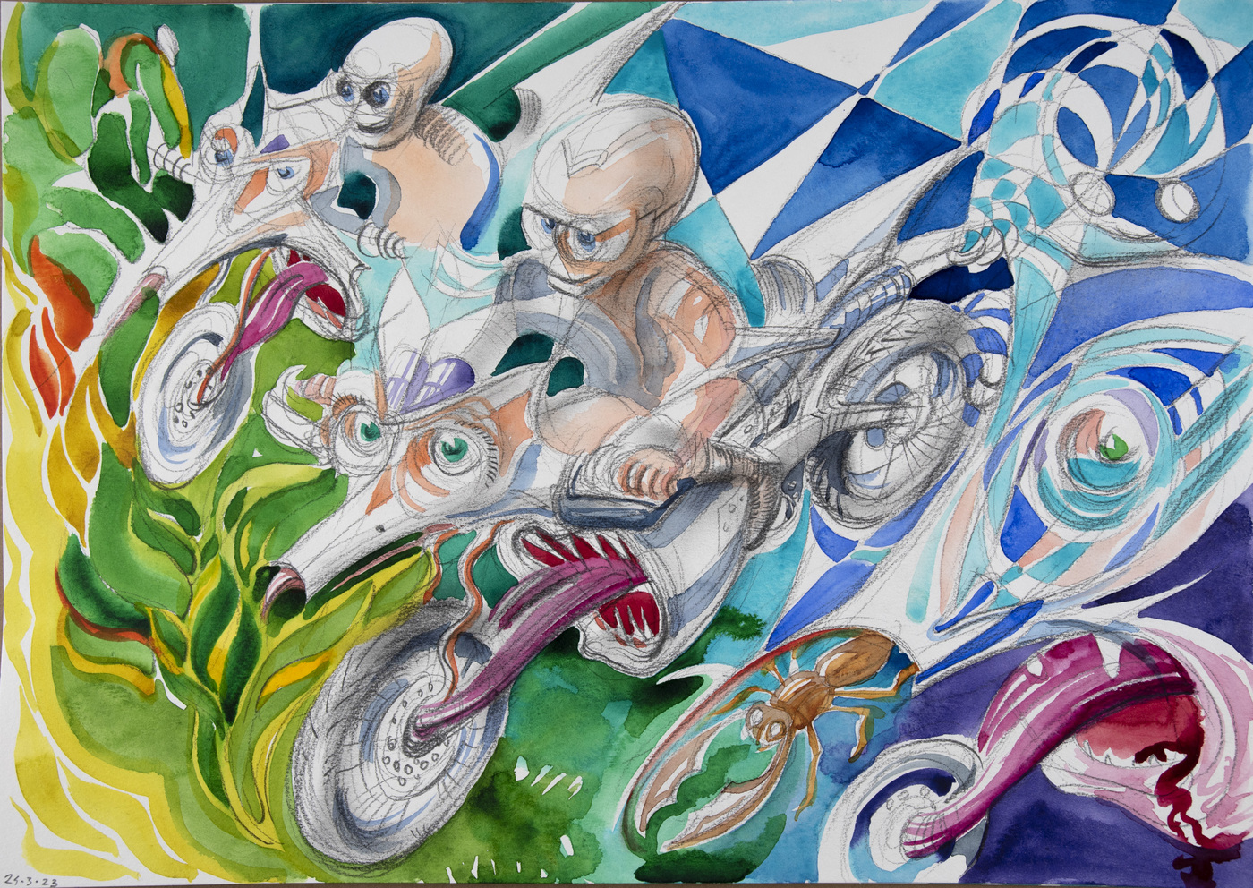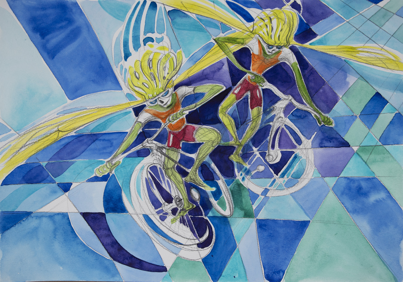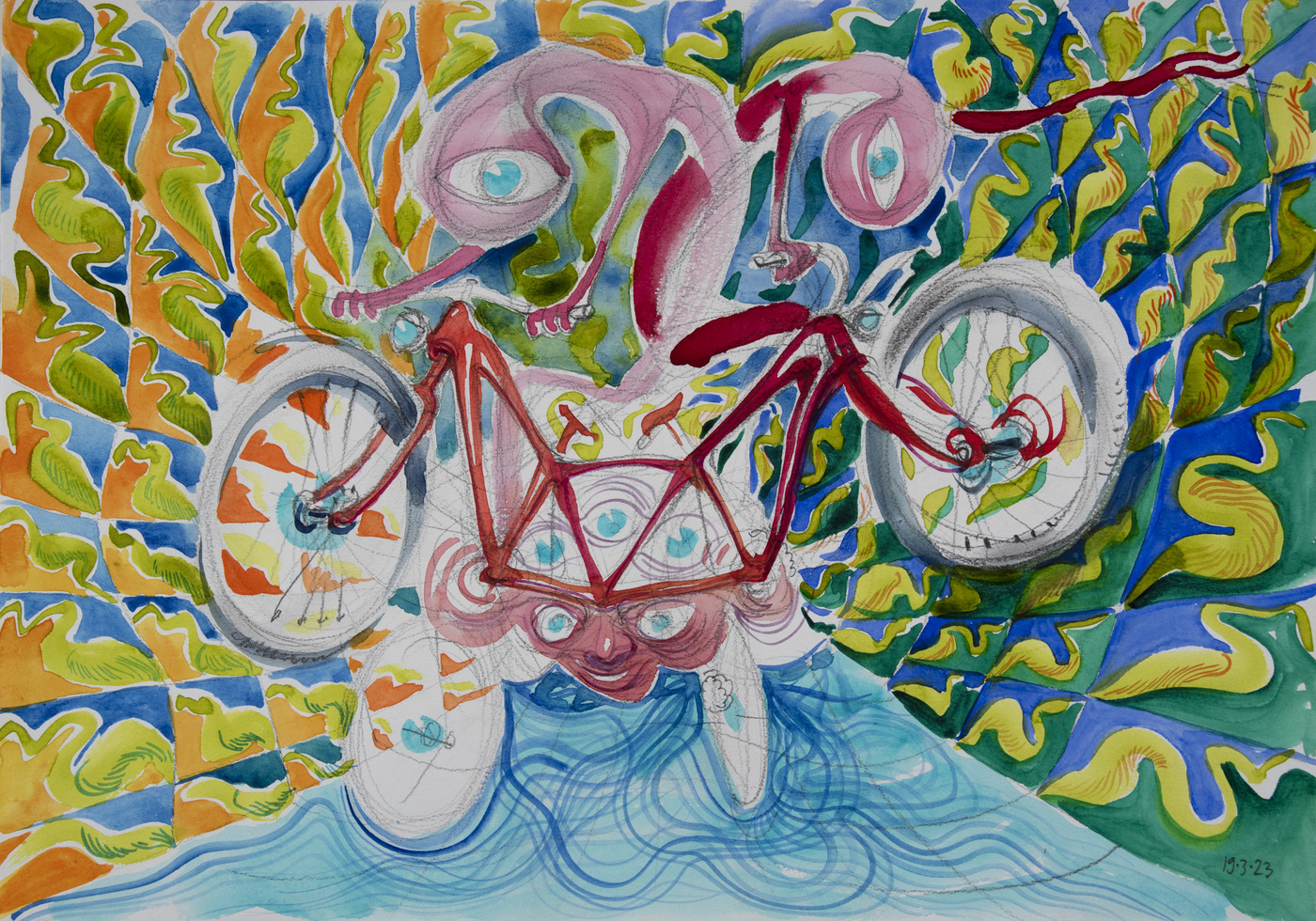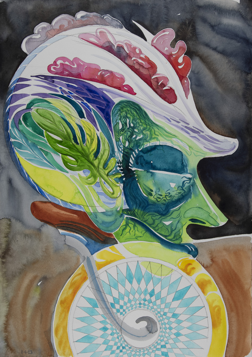 The cycle of watercolors on the theme of Bicycle Days was created on the occasion of the 80th anniversary of the famous Bicycle Day, which is associated with the invention of LSD. However, riding a bicycle in pure nature is an uplifting experience even without any hallucinogens. The gyroscopic miracle of balance and riding through avenues of blossoming trees...